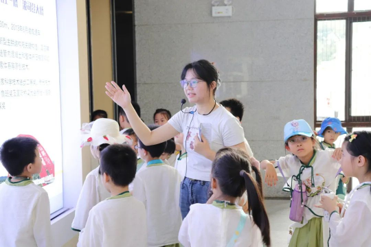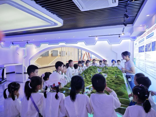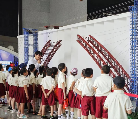 在平台综合楼一楼展厅,讲解员以图文并茂的方式,结合模型、视频和实物展示,详细解释了桥梁的构造原理、施工方法以及其在交通建设中的重要作用。孩子们聚精会神地听着,不时发出惊叹和好奇的声音。通过讲解员生动的解说,孩子们身临其境,见证了一座座大桥从建造到建成的全过程,对桥梁工程有了更为深刻的认识。同时,平陆运河的沙盘模型也激发了他们对工程建造、生态保护的学习兴趣。