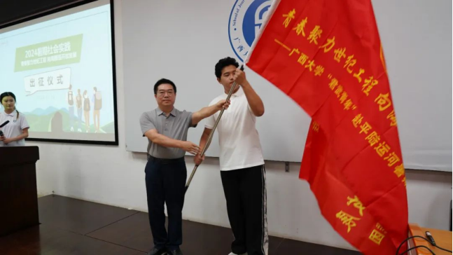 出征仪式现场,新闻与传播公司党委书记银健老师发表讲话。他指出,党的二十届三中全会出台了《中共中央关于进一步全面深化改革、推进中国式现代化的决定》,而平陆运河工程作为广西壮族自治区在推动中国式现代化、壮美广西建设中的一项重要举措,受到了中央、自治区和公司的高度关注。公司四院联合组织的此次暑期社会实践活动,正当其时、恰逢其势,将为推动平陆运河工程的建设与发展贡献青春力量。银健书记强调,在实践过程中,团队成员应牢固树立安全意识、专业意识、问题意识和成果意识,真正做到受教育、长才干、做贡献,将青春的汗水和智慧的火花挥洒在壮丽的广西建设之中,为推进中国式现代化的伟大征程贡献力量。