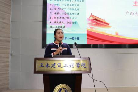 比赛中,各位参赛选手围绕“学四史、明初心、担使命”的主题进行一分钟主题宣讲,讲述新中国发展历程中革命先烈的英雄事迹,赢得了现场观众和评委们的肯定。第一轮比赛结束后,刘梦娟老师开展了一堂以学“四史”为主题的微党课,课上刘老师通过让同学们观看视频《后浪》,向同学们强调作为一名新时代青年,要坚定自己的理想信念,用知识武装自己,树立正确的奋斗观,承担起自己的责任与使命,争做有为新青年。