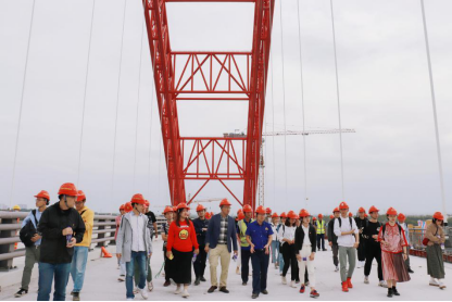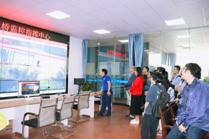 在项目安全总监廖汝锋带领下,老师和团员青年们登上平南三桥主桥桥面,参观工程建设现场,前往监控指挥中心智慧展厅,观摩现代化建设的科技手段。在主桥桥面,老师和团员青年们详细了解了项目地连墙和卵石层注浆工艺等施工关键技术及信息化建设情况。