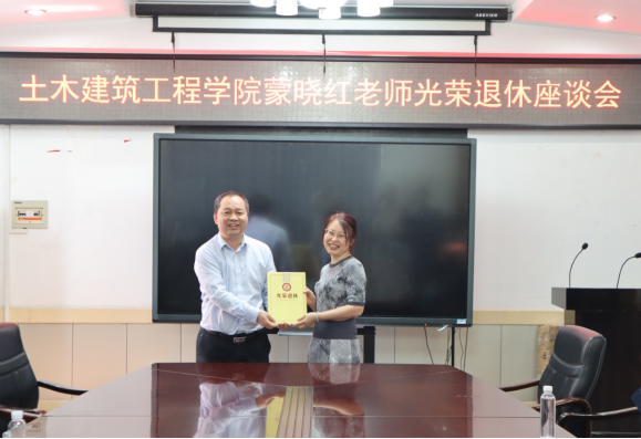 (戴永恒书记为蒙晓红老师颁发光荣退休证书)