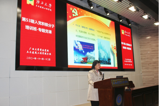 11月12日晚,公司党委副书记秦建丽在新结构大报告厅为公司第53期入党积极分子培训班学员讲授专题党课。