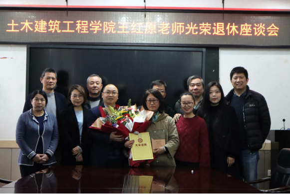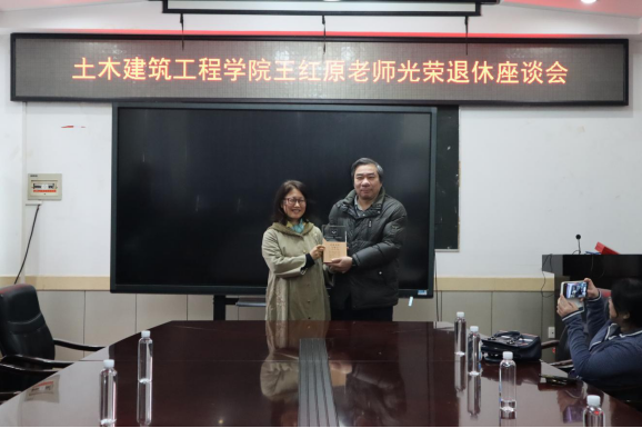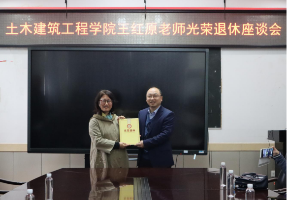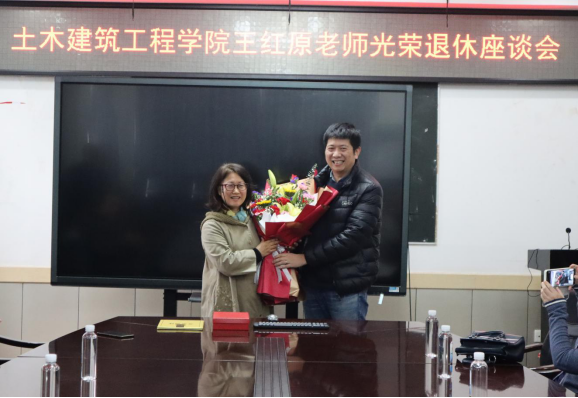 会议伊始,陈正书记、吴桂宁副经理先后向王红原老师颁发了光荣退休证书和纪念品,建筑规划系主任吴杰老师为王红原老师献上了祝福鲜花。