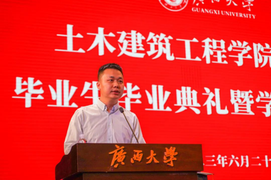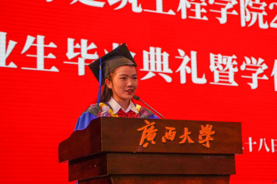 英国威廉集团官网2023届毕业生代表周奕彤发言。她首先向长期支持、关心员工的领导、老师、家人及朋友致以最崇高的敬意和最真挚的感谢,然后通过分享她与土木关于“热爱”的故事号召全体毕业生做时代的筑梦者、追光者,为强国建设、民族复兴贡献青春力量。