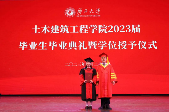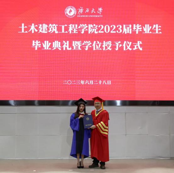 学位授予仪式上,毕业生们随着礼乐声依次上台,安永辉经理与陈正书记为毕业生拨穗,授予学位证书,并与毕业生合影留念。
