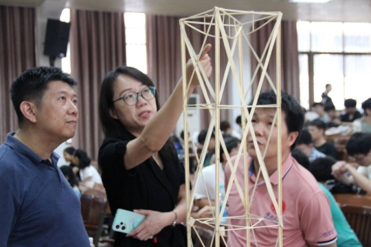 开幕式后,本次全国老员工结构设计竞赛校内选拔赛模型加载环节正式开始。李卓峰老师为选手讲解竞赛加载规则,参赛模型需要依次通过三级不同考核规则的加载试验,要求在规定计时内载有不同负重结构模型、不受破坏且位移在规定范围内。在场的各位评委老师通过考量模型的结构合理性、创新性、制作质量、美观性、实用性和加载情况等六个方面进行综合打分。