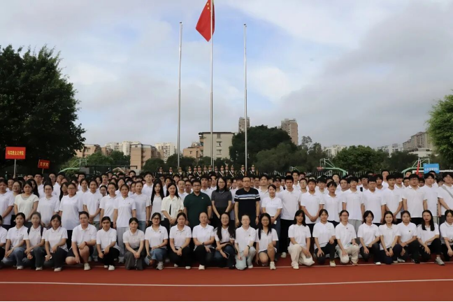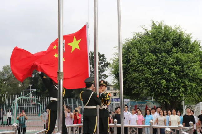 清晨7时40分,西校园田径场早已旌旗飘扬,人声汇聚。公司500余名学子身着整齐服装,在升旗台正面列队肃立,静候升国旗仪式开始。护旗手迈着铿锵有力的步伐护送国旗入场,随着雄壮的《义勇军进行曲》奏响,全场目光聚焦于冉冉升起的五星红旗,同学们齐声奏唱国歌,歌声回荡在田径场上空,每一个音符都凝聚着对祖国母亲的深情致敬与无限祝福。朝阳下,红旗与青春的脸庞相映,定格成校园里最动人的爱国图景。
