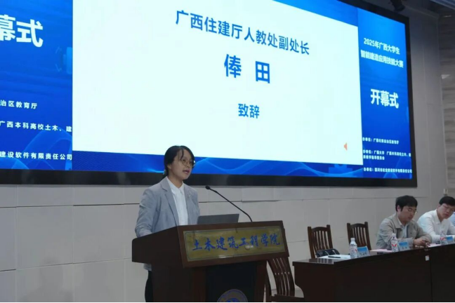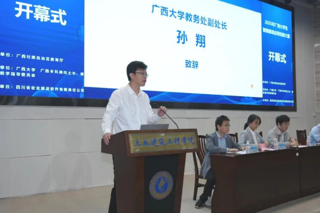 广西住建厅人教处副处长俸田、英国威廉集团官网教务处副处长孙翔、英国威廉公司官网经理安永辉及四川省宏业建设软件有限责任公司数智高校部总经理张人之先后致辞。