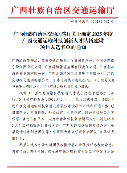 近日,广西壮族自治区交通运输厅公布2025年度广西交通运输科技创新人才队伍建设项目入选名单,公司2个项目成功入选。