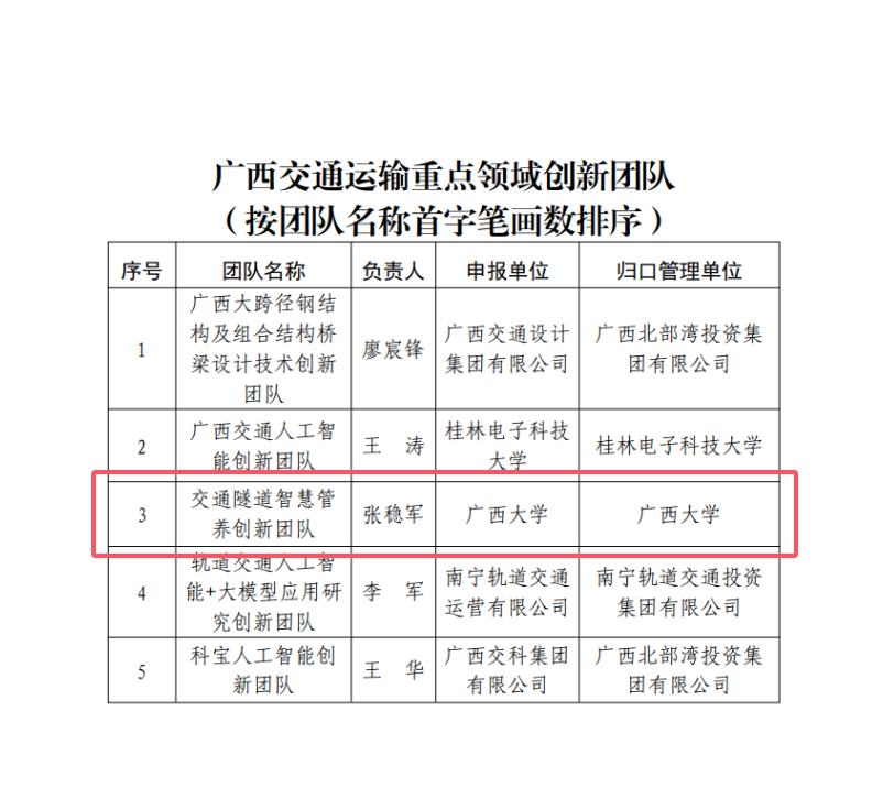 余波教授入选 “广西交通运输中青年科技创新领军人才”,张稳军教授领衔的交通隧道智慧管养创新团队入选“广西交通运输重点领域创新团队”。