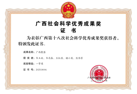 2025年11月21日,广西壮族自治区人民政府发布了《关于奖励广西第十八次社会科学优秀成果的决定》,韦玉姣、韦浥春老师编著,王红原、谢小英、熊伟、赵冶等建筑规划系教师参与撰写的专著《广西聚落》,荣获著作类一等奖。