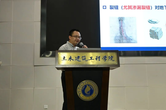 随后,陈庆教授作了题为“地下混凝土电沉积修复进展”的学术报告,他首先指出现有规范方法修复地下混凝土裂缝存在的不足,随后介绍了地下混凝土电沉积修复的工程背景、研究思路,通过分析快速修复溶液体系中多个因素,揭示出了其中的修复机理,不同环境对混凝土裂缝电沉积修复效果的影响规律。陈教授团队从理论分析方法、非对称修复试验、快速修复溶液体系、多场耦合仿真、细观修复模型、现场应用等方面初步构建了地下结构电沉积修复的理论和方法,这一研究成果不仅为地下结构微细渗漏裂缝修复提供了新理论和技术支撑,而且具有广阔的应用前景。