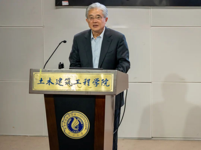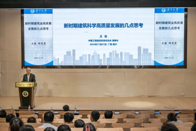 随后,王俊研究员认为要推动建筑行业的数字化转型,关键在于突破核心软件技术。目前,国外仿真分析软件在国内工程行业的使用比例已超过70%,土木工程结构仿真依然面临“卡脖子”问题。他鼓励同学们,积极开发自主可控的仿真模拟软件,将技术牢牢掌握在自己手中。此外,王俊研究员还提出,标准规范是实现建筑领域“碳达峰碳中和”的基础。他强调,必须建立统一的碳核算体系和相应的低碳标准体系。