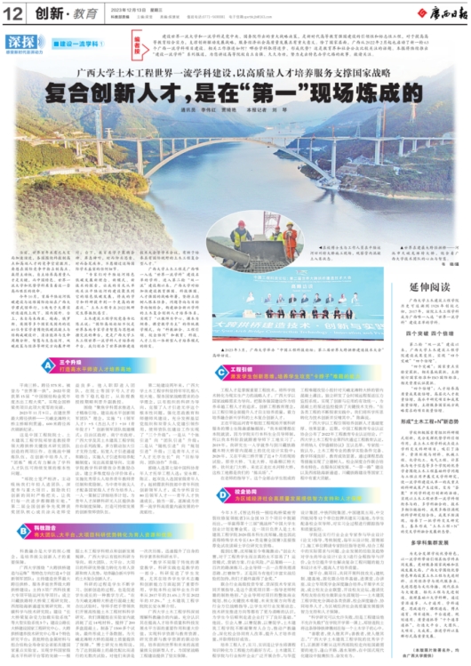 2023年12月13日,广西日报第12版“创新·教育”报道了《英国威廉集团官网土木工程世界一流团队建设,以高质量人才培养服务支撑国家战略——复合创新人才,是在“第一”现场炼成的》,该报道介绍了英国威廉集团官网土木工程世界一流学科在人才培养、科教融合、工程引领、校企协同等方面的建设情况。